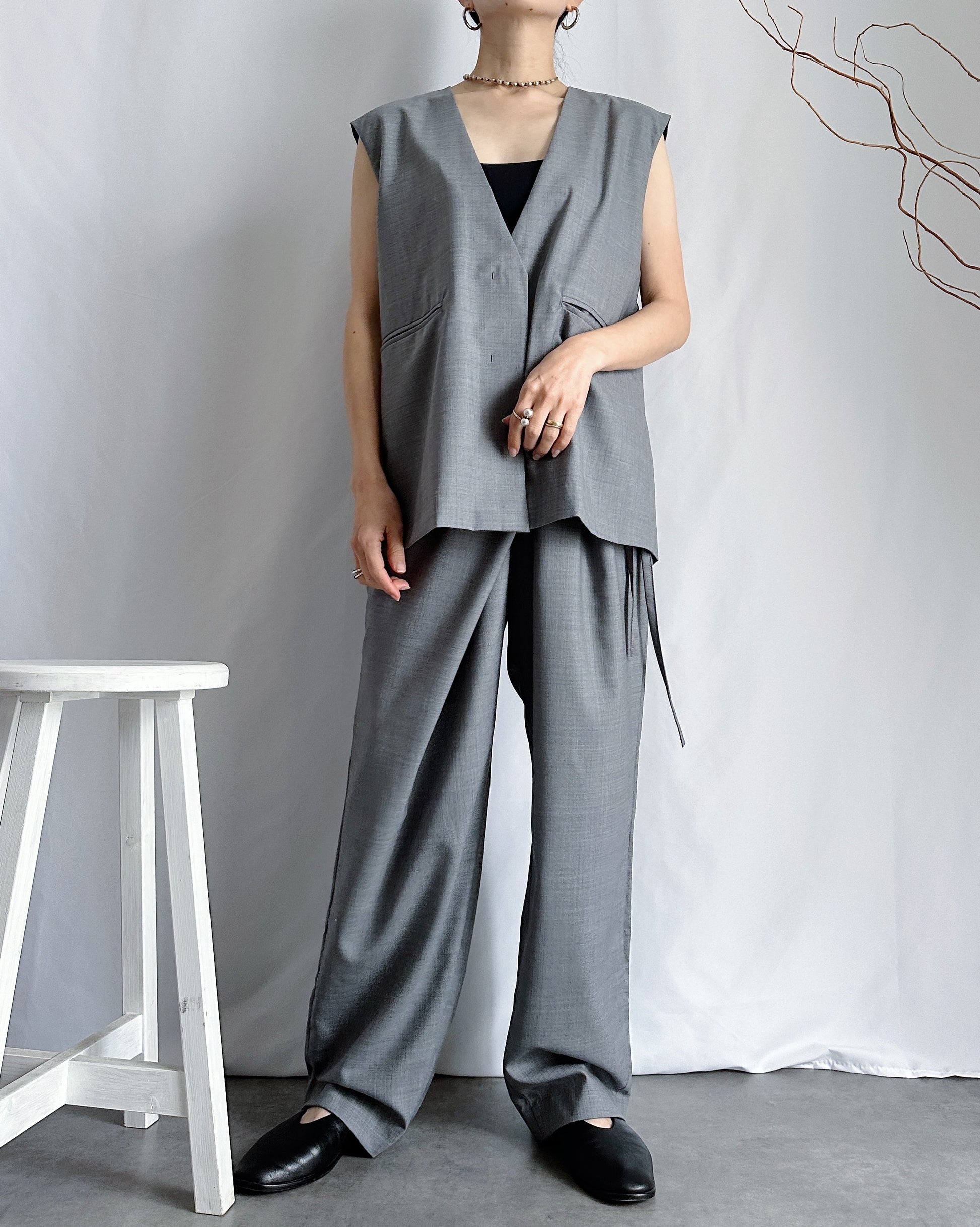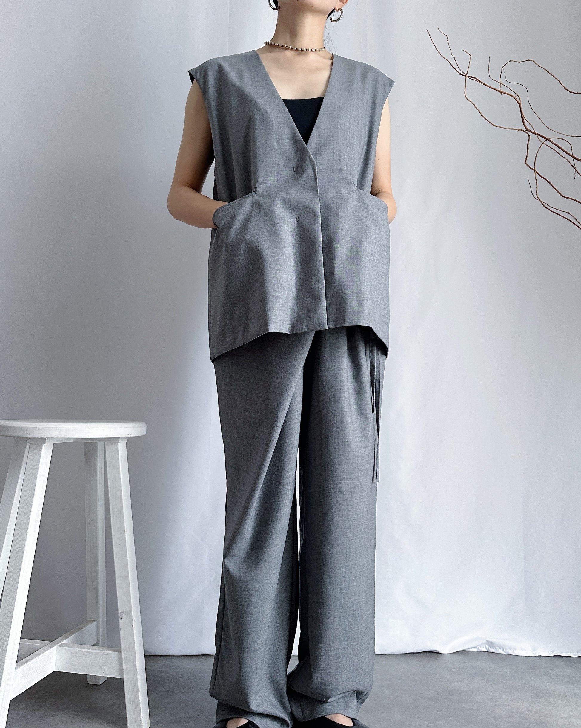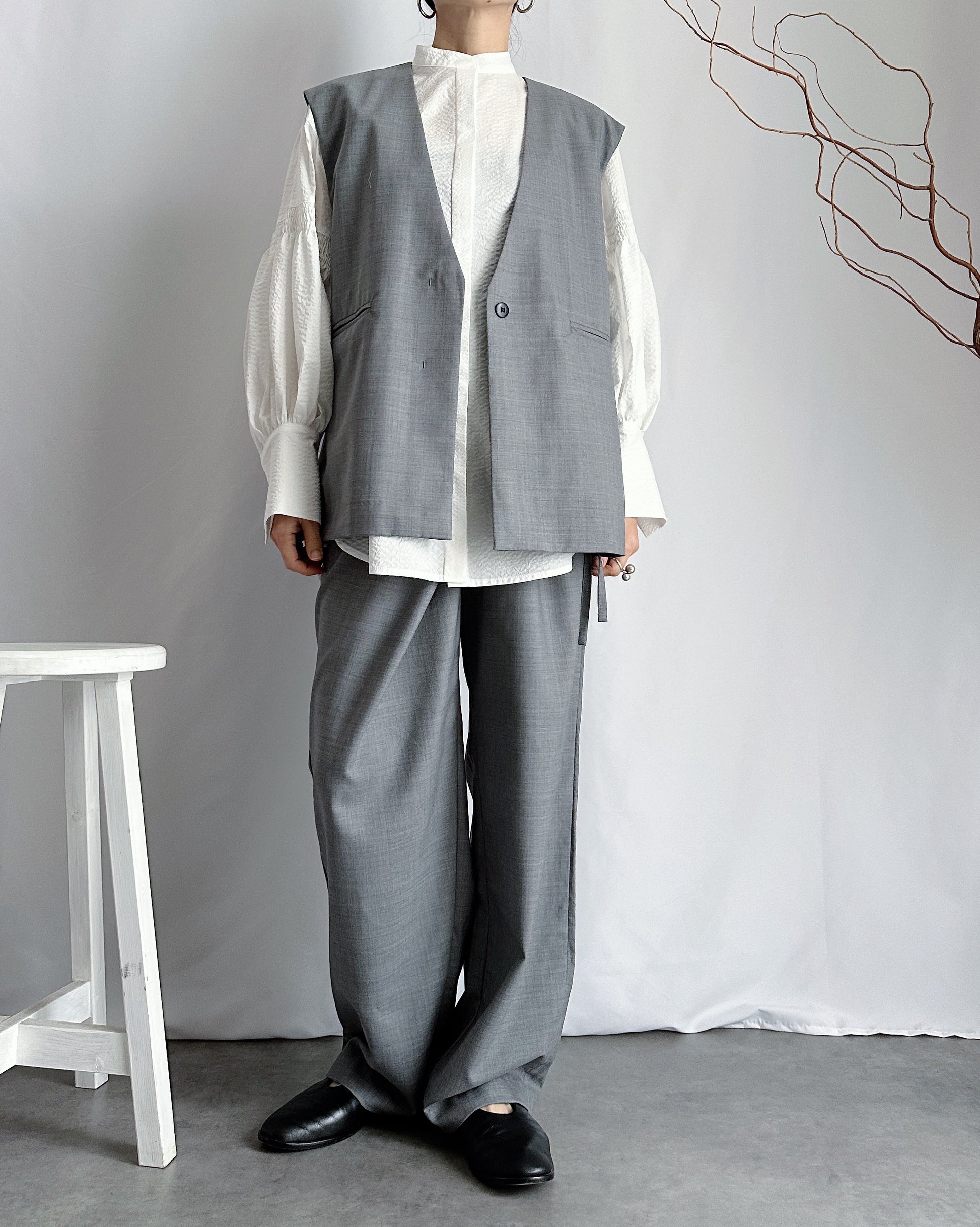同素材のトロピカルウールラップパンツと合わせていただくことで、